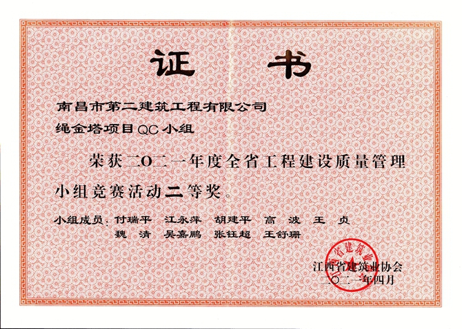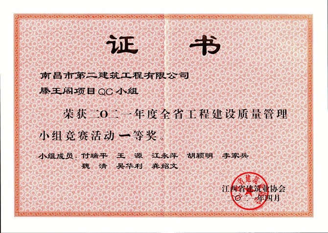 4月27日,江西省建筑業(yè)協(xié)會(huì)召開(kāi)全省建筑業(yè)全面質(zhì)量管理成果發(fā)布會(huì),我司報(bào)送參賽的南昌第六糧庫(kù)項(xiàng)目QC小組的《提高軟弱地基強(qiáng)夯施工一次驗(yàn)收合格率》QC成果和滕王閣項(xiàng)目QC小組的《提高古建砼戧梁驗(yàn)收合格率》QC成果獲得一等獎(jiǎng),繩金塔項(xiàng)目QC小組的《提高高空弧形挑檐施工質(zhì)量》QC成果獲得二等獎(jiǎng),為促進(jìn)企業(yè)技術(shù)創(chuàng)新和科技進(jìn)步、提升企業(yè)品牌形象添勁加力。