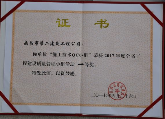 技術(shù)質(zhì)檢部貫徹公司質(zhì)量標(biāo)準(zhǔn)化管理精神,以切實(shí)提高工程質(zhì)量為目標(biāo),積極開展全面質(zhì)量管理技術(shù)攻關(guān)活動(dòng),所撰寫的《提高GC泡沫水泥保溫板外墻外保溫施工質(zhì)量 》QC課題成果,榮獲“2017年度全省工程建設(shè)優(yōu)秀質(zhì)量管理小組活動(dòng)一等獎(jiǎng)”。